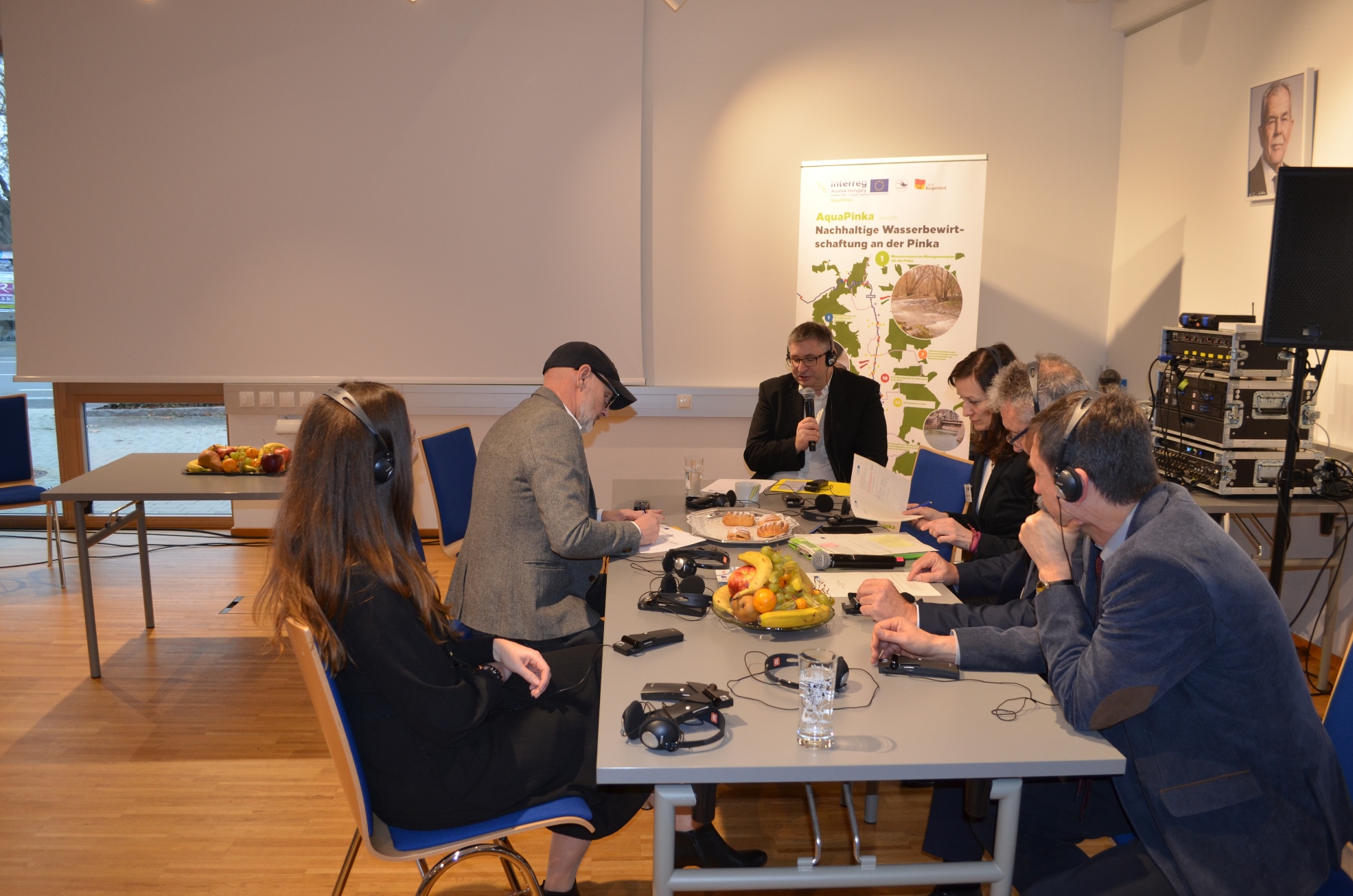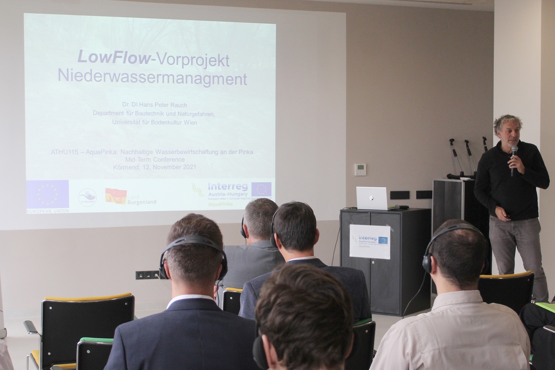 A köszöntők után a szakmai előadások következtek. Elsőként a Belügyminisztérium részéről Jelinek Gabriella osztályvezető hangsúlyozta a vízkészlet-gazdálkodás határon átnyúló kérdéseit, majd a bécsi BOKU egyetemről érkező Dr. Hans Peter Rauch, a Talajtani munkacsoport vezetője mutatta be az AquaPinka elődjét, a kisvízi vízgazdálkodással foglalkozó LowFlow projektet.