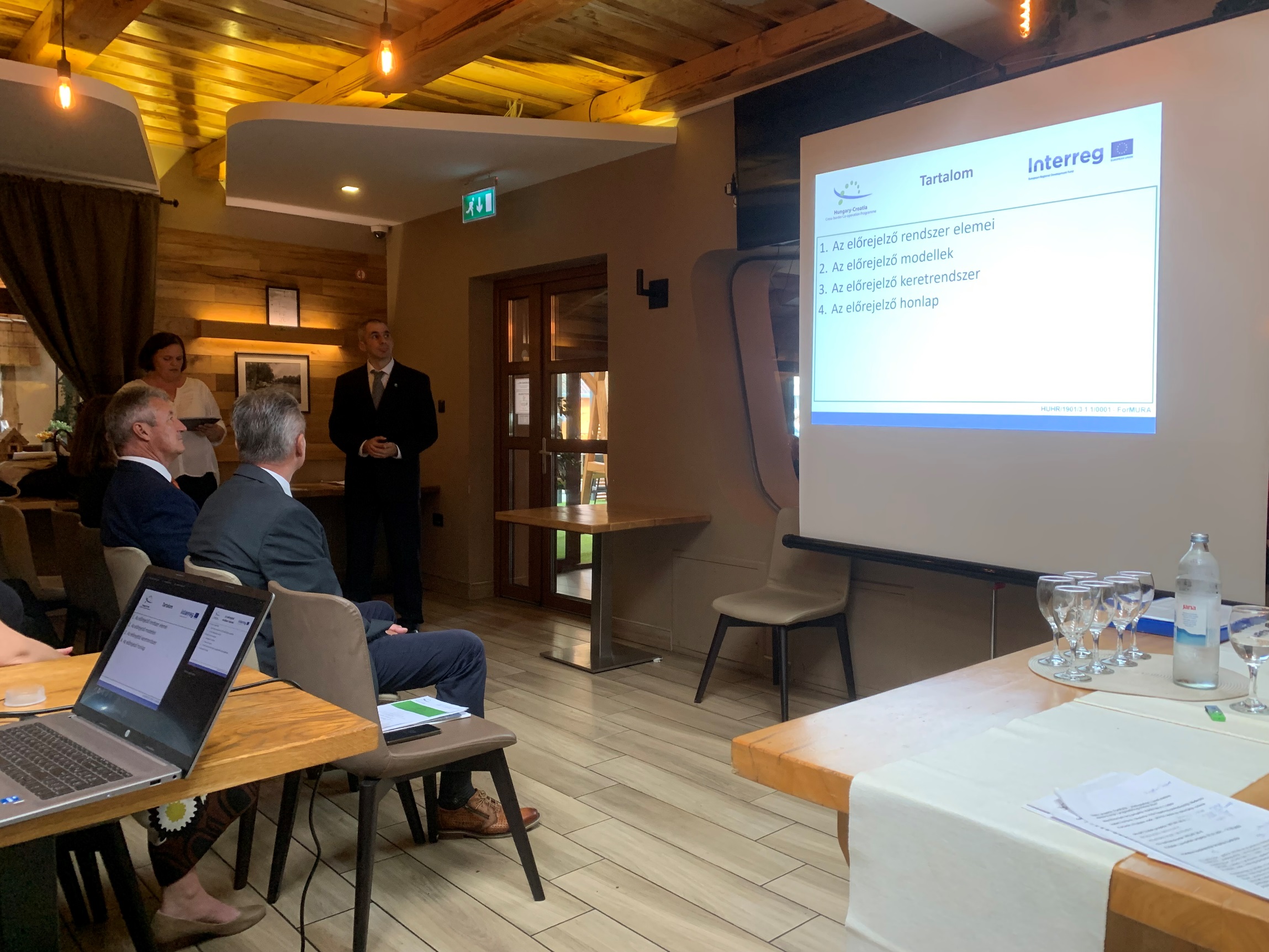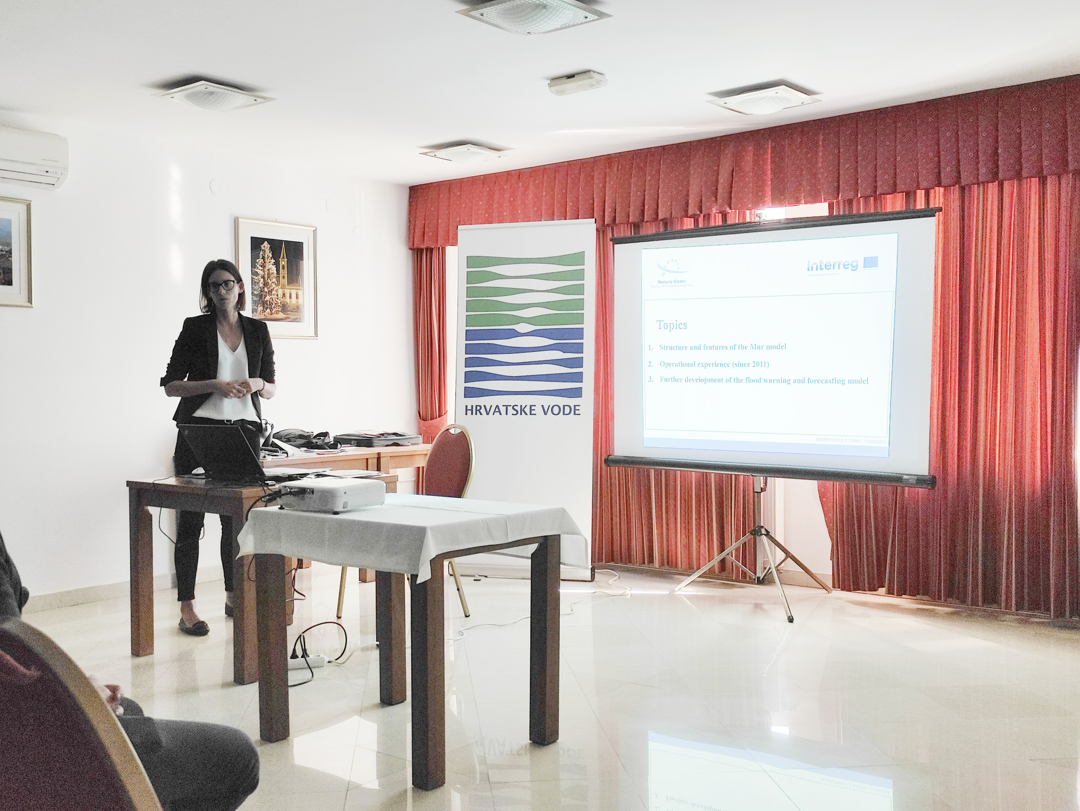 A horvát projektvezető köszöntőbeszédét követően a magyar és horvát előadók a következő témákat ismertették a résztvevőknek: a ForMURA projekt tevékenységei, az árvízi előrejelző modell általános bemutatása, előrejelző modell a Horvát Köztársaságban, a Mura folyó előrejelző modell, harmonizáció a jelenlegi modellfejlesztésben, múltbeli tapasztalatok a radaros berendezésekkel való munkák során, valamint új berendezések telepítése a projekt keretében és a berendezések telepítési helyszínei.